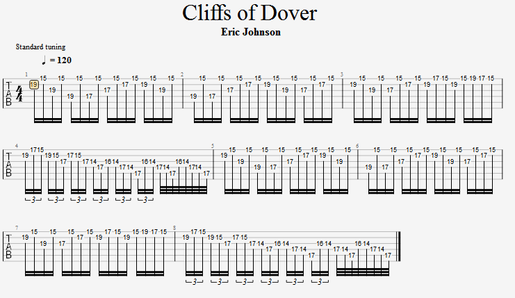 这是来自于eric johnson的名曲《cliffs of dover》里的一段乐句。我们可以看到在乐句的前三个小节里有其实就是一个大幅度的跨弦。