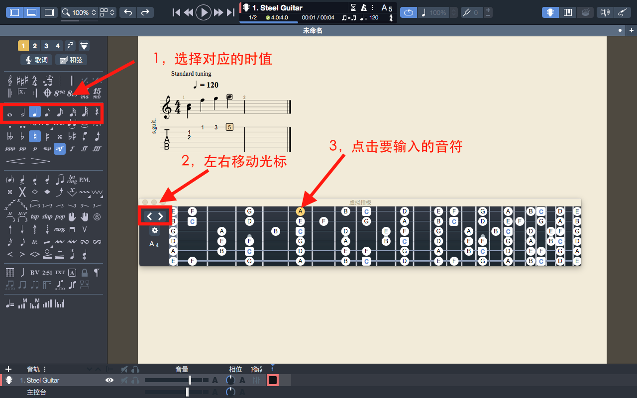 在我们右侧面板选择相对应的时值----点击虚拟乐器面板上左右方向图标将光标移动到指定位置---点击需要输入的音符