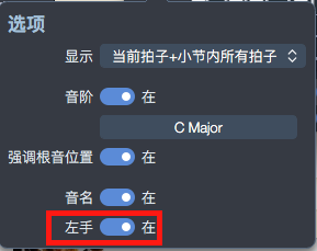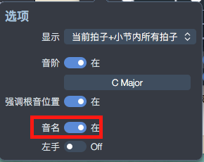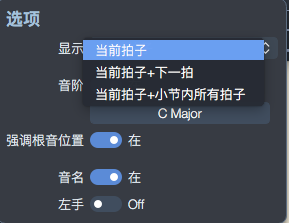 比如当选择『当前拍子』时,光标所在的这一拍上有的音符就会在虚拟指板上亮起。同样的,当选择『当前拍子+下一拍』,『当前拍子+小节内所有拍子』时光标所在的这一拍上有的音符也会在虚拟指板上亮起。