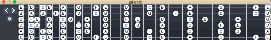 在最下面的这个区域中,显示的是我们音阶的组成结构,包含了音阶的三个信息,音阶组成音的音名,方框9中所示,音阶的音程结构,方框8所示,音阶内各音的级数,方框7所示。这是我们学习一条音阶必须要掌握的三个指标,这里面有海量的音阶,当我们需要学习一个新的音阶时,选定它,就可以了解到它的相关信息。同时,我们还可以看到它在指板上所有音的分布位置,如下图所示。