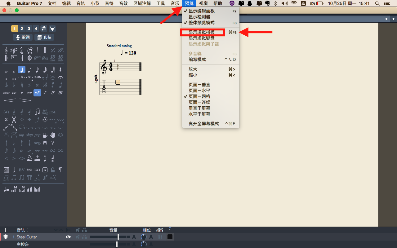 Guitar pro 7做为一款常用的打谱软件,相信很多使用者都会用键盘进入输入内容,今天我们要来介绍这的虚拟吉他指板功能,这个输入方式会更符合吉他演奏者的习惯。下面我们用图文的方式来给大家展开说明。