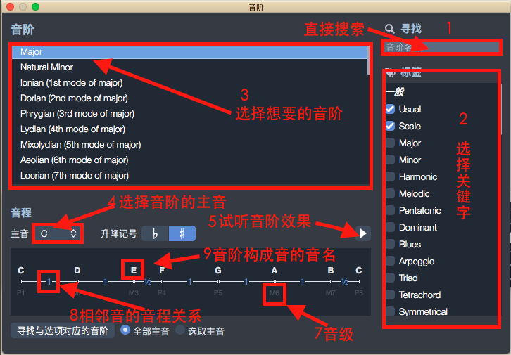 我们可以在方格 1 中直接输入音阶的名字,然后在方格三区域选择我们要的音阶。如果我们在创作过程中并还没有明确要用什么音阶,我们就可以在方格2的区域选择关键字,方格3区域就会显示相关联的音阶。