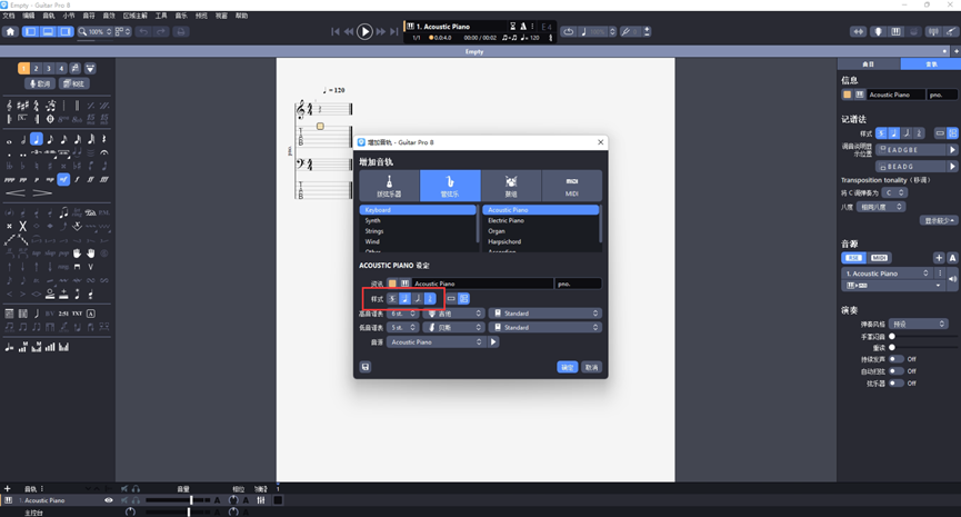 1.新建音轨选择任意样式+六线谱,比如五线谱+六线谱