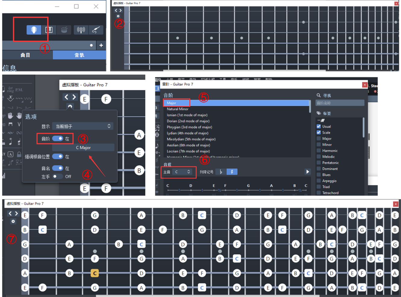 我们试试用Guitar Pro 7中的“虚拟指板”,来表示这12个音。首先点击右上角工具栏,类似琴头图标,会弹出一个“虚拟指板”,之后点击窗口左侧的齿轮,将“音阶”开关打开,选择“Major”,随后指板上就出现了所有大调音阶对应的音名(图8)。