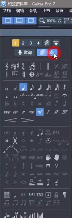 在编辑面板中,大家可以自由输入音符符号。面板顶部有“歌词”和“和弦”两个部分,点击“和弦”即可弹出和弦资料库。