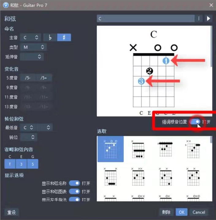 在和弦添加界面中,大家可以通过右上方的“▶”图标来试听当前和弦。此外,右上方的显示区域还可以使用鼠标进行编辑,改变指法位置。强调根音开启后,和弦图中的蓝色图标即是根音的位置,大家在弹奏时可以多注意下这一小细节。