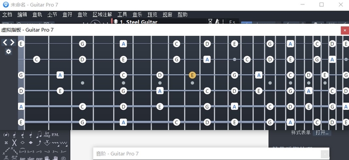 下图是Guitar Pro中C大调音阶在吉他指板上的所有音符: