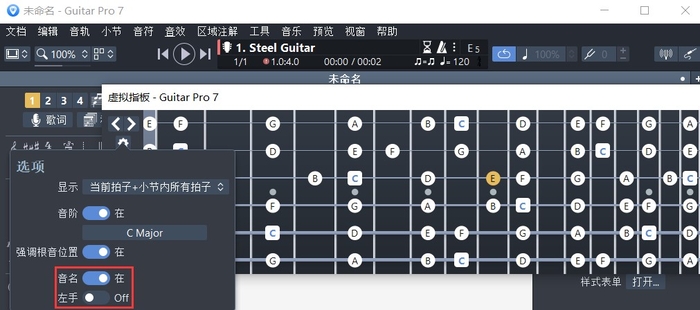 如果大家想看吉他指板图上的音名,可以点击Guitar Pro指板图的左边“齿轮”打开“音名”选项,这样在吉他指板图上就会显示出每一个音的音名了。如果是左手按弦的小伙伴,可以打开“左手”选项,这样指板就会变成左手位了。