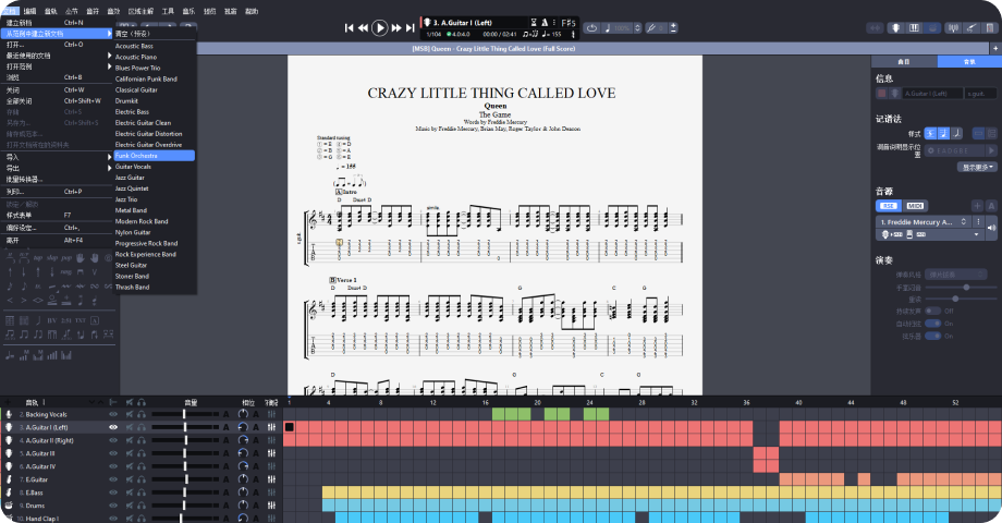 在多轨乐谱下,您可以使用吉他,贝司,尤克里里,鼓,钢琴,人声,弦乐,铜管等数十种乐器创建乐谱。