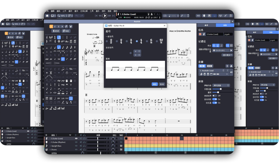 只需直接在五线谱或六线谱上编辑,即可轻松谱写自己的乐章。所有与吉他及其他弦乐器有关的常用音乐符号都可为你所用。