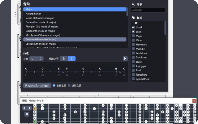 查看和试听丰富的各类音阶。所选音阶可以显示在指板上或钢琴上,帮助您创作歌曲,写独奏或旋律。
