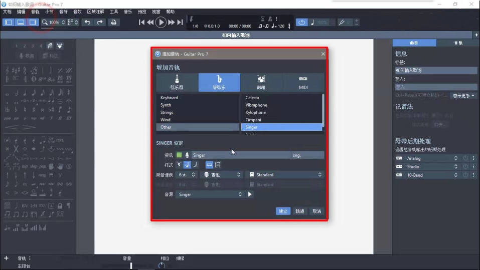 打开增加音轨画面后,单击“管弦乐”且将下方的英文调整为“Other”和“Singer”,最后点击“建立”即可。