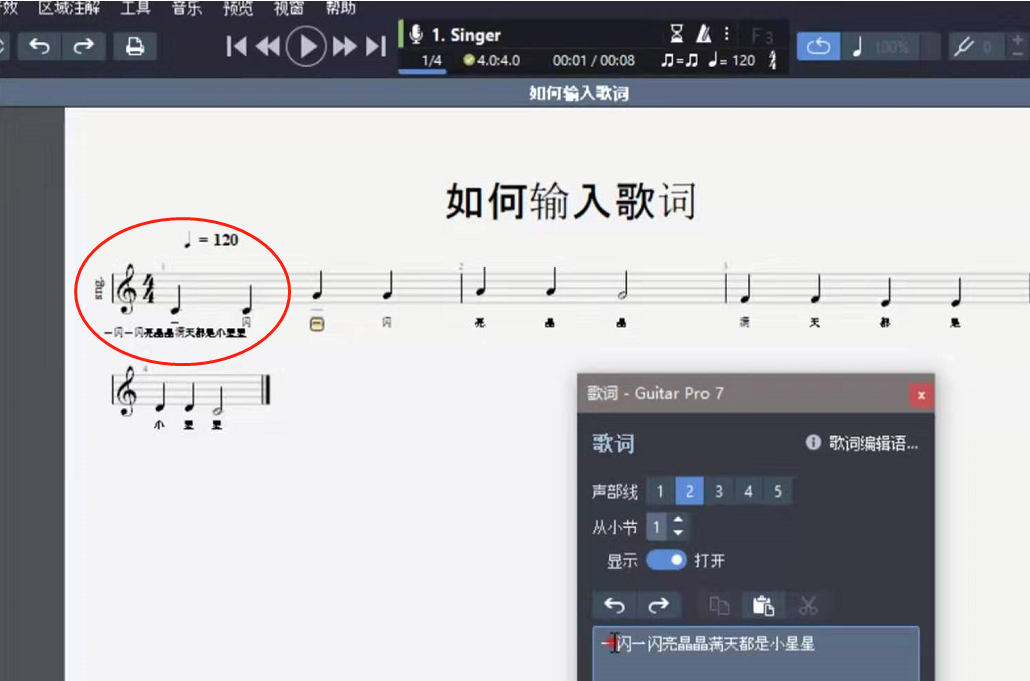 同行的五线谱中,可以输入第二段文字。点击“声部线”,根据当前要输入的文字行数来选择1—5。再次输入文字后,歌词就会在同一五线谱的下一行出现了。Guitar Pro中,最多可容纳5行歌词。