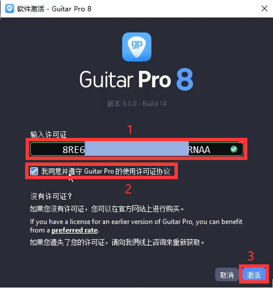 2.将订单中心里的注册码复制输入至下图中,勾选【我同意并遵守Guitar Pro的使用许可证协议】,点击【激活】。