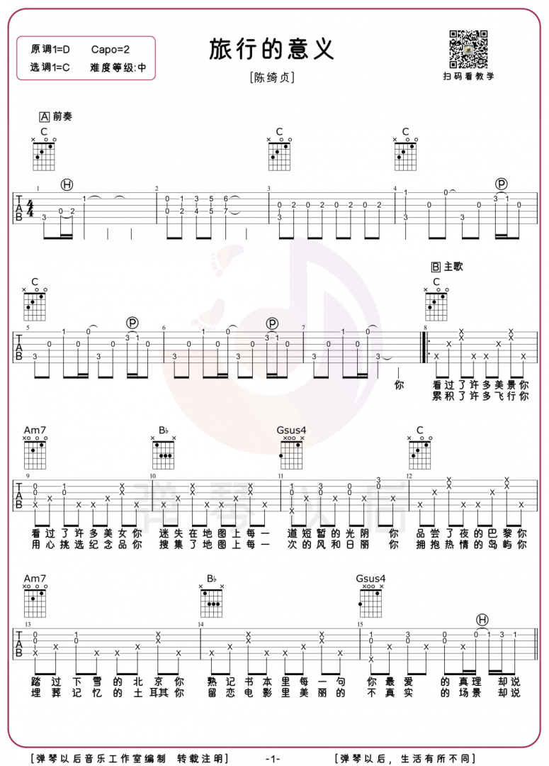 音乐让生活更美好,以上是GuitarPro中文官网为大家免费提供的陈绮贞《旅行的意义》吉他谱,希望对大家能够有所帮助,GuitarPro中文官网会定期推出高质量吉他谱,希望大家关注GuitarPro中文官网!