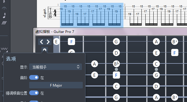 首先打开guitar pro7的工具中打开选择音阶,打开指板。这时候,指板的音阶会停留在我们上一次打开乐谱所选择的音阶上。比如说F大调音阶。