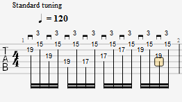 然后简单观察乐句,会发现,前三小节几乎都围绕着第十七品的二三四弦和十九品的二三四弦去演奏的。我们依次点击他们会得到,十七品弹了C、E、G(C大三和弦),十九品弹了D、#F、A(D大三和弦),六弦十五品弹得则是G。