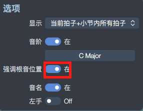 如果这个选项打开,那么指板上所有根音的位置就会变成方格,与其它音的圆形区分开来,如下图所示