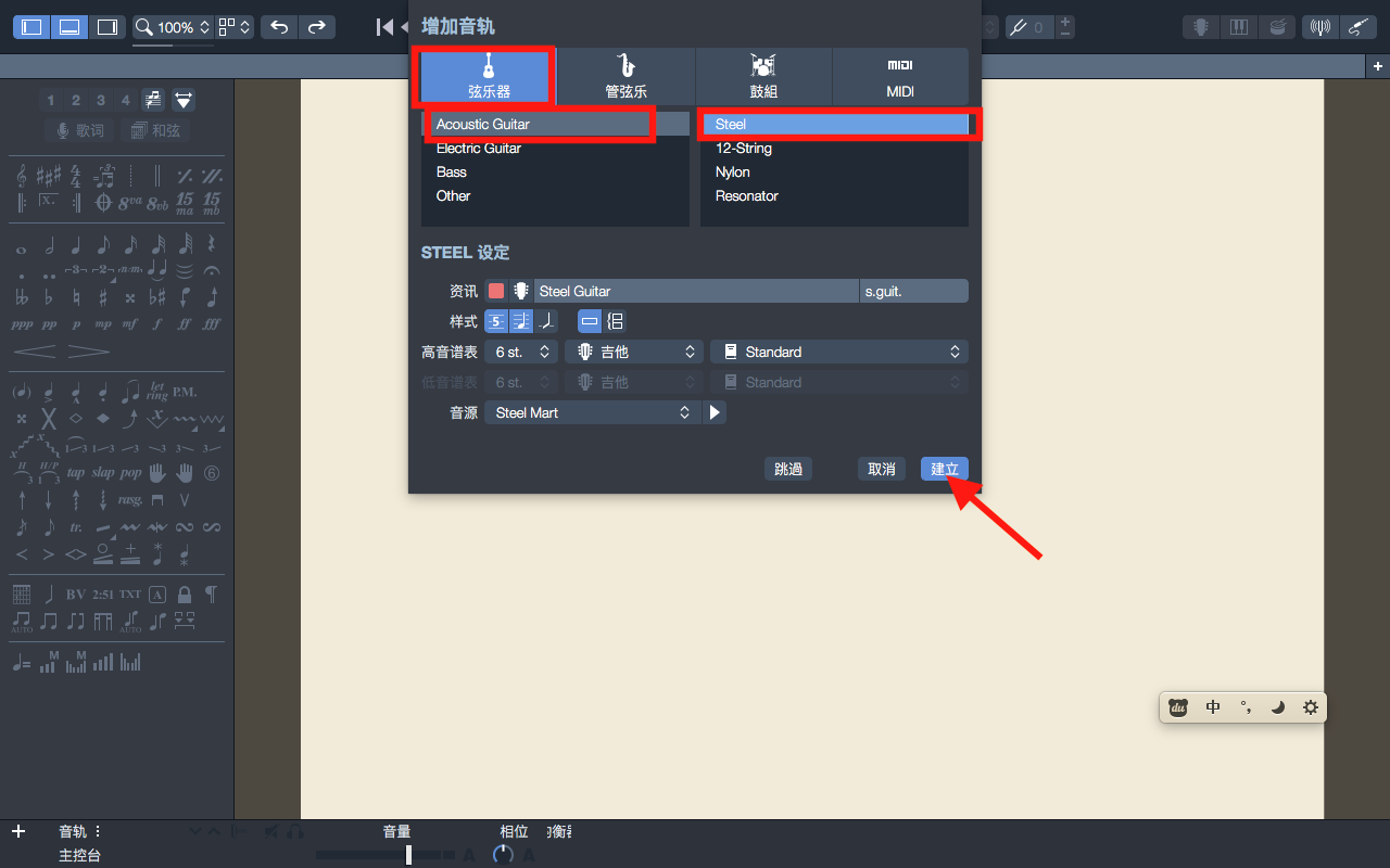 选择『弦乐器』---选择『Acoustic Guitar』---选择『Steel』---点击『建立』