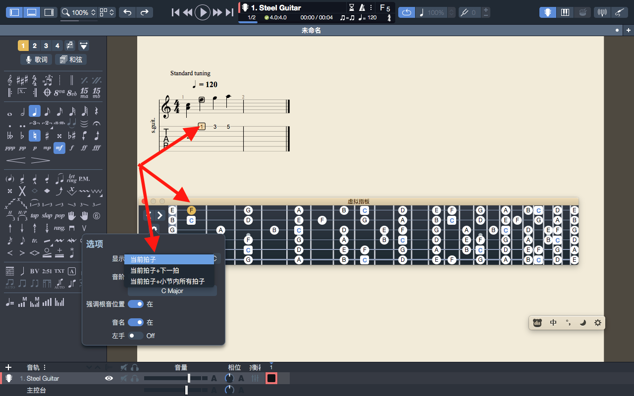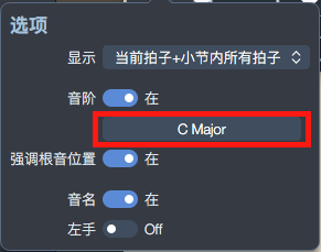 比如当选择『当前拍子』时,光标所在的这一拍上有的音符就会在虚拟指板上亮起。同样的,当选择『当前拍子+下一拍』,『当前拍子+小节内所有拍子』时光标所在的这一拍上有的音符也会在虚拟指板上亮起。