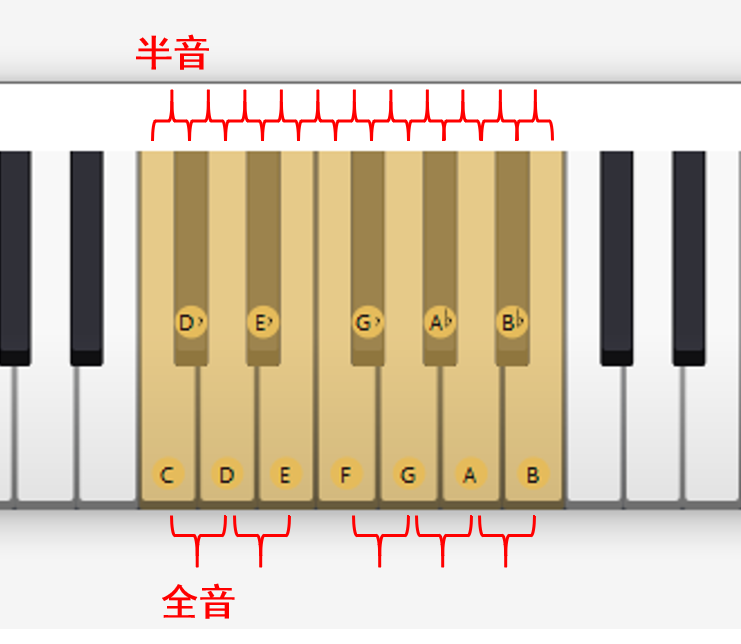 那这12个音有什么关系呢?两个相邻的键的距离,例如C和C♯,或者E和F,称为一个半音;而相隔一个键的距离,例如C和D或者E♭和F,称为一个全音(图7)。简单来说,就是半音+半音=全音。