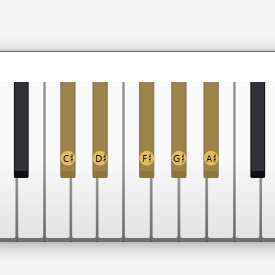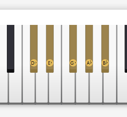 再看看黑键,点击所有的黑键后,可以发现黑键显示出的名字,比刚刚白键都多出了一个“♯”符号,叫做升号(图5)。实际上这五个黑键同时也能有另外一种名字(图6),出现了另外一种符号“♭”,叫做降号。虽然名字不同,但它们都代表着同一个音,并且也是有规律的,例如C♯,它比C要高,因此它叫C♯(读作升C,英文读作C sharp),它又比D低,因此它也叫D♭(读作降D,英文D flat)。那这五个黑键相对于基本音级,它们叫“变化音级”。
