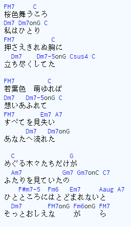 在文章的开头先说一下这篇文章的写作动机。笔者作为一名吉他手很习惯去关注一些音乐类的资讯,最近听到一首吉他伴奏的《浮生未歇》,尽管只是一个新手的翻唱,旋律却非常抓人。听了一半,忽然反应过来原来是中岛美嘉原唱的《樱花纷飞时》配上了中文的歌词。专业原唱和业余翻唱在唱功方面当然存在差距,但是笔者研究了一下和弦使用的方面,发现这种差距同样是存在的。贴出两首歌的CHORD谱(部分)的对比可以很清晰地看出来。