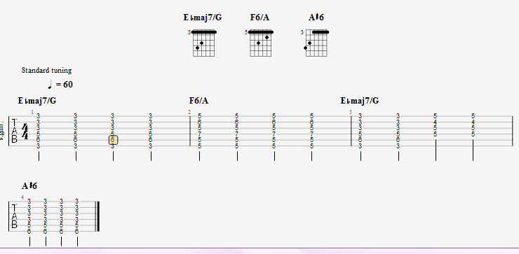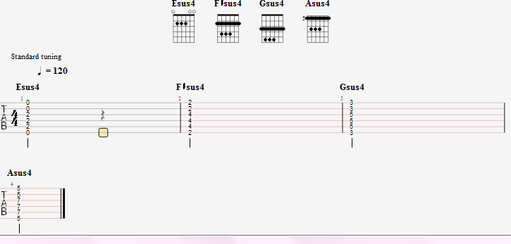 那么说了这么多,我们开始本期文章的重点,使用大横按加第一把位的开放和弦,寻找指板上更多的特殊和弦。在guitar pro7上建立新文档,然后键入以下三个柱式和弦,这个时候和弦上是没有和弦标识的。