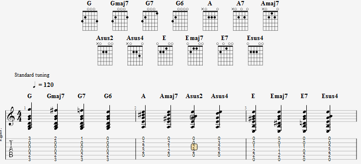 在上图中我们可以看到,这三个大三和弦(G、A、E)所变化出来的和弦全部够可以用三根或者两根完成,而且对手指的要求都不高。对于这些和弦,稍加练习,我们很轻松就可以记住。只需要练习到看到和弦标记就能在指板上反应,就可以学会本期文章的内容。