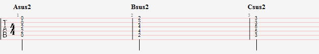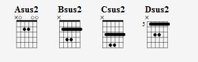 其实这几个和弦的指法并不算困难,那么我们如何灵活运用呢?比如说需要一个Dsus2和弦,恰好你又不知道在它在第一把位的指法。这个时候就可以运用上图的技巧,把Asus2大横按推进到第五品,获得一个高把位的Dsus2和弦。