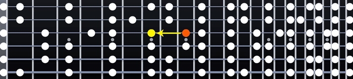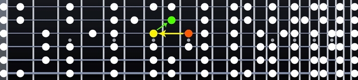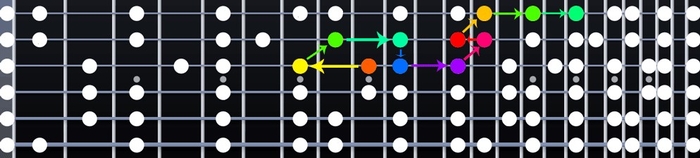 这个音阶训练,需要我们从任意的指板位置上看到该音阶中所邻近的音符。我们不仅需要考虑到附近的下一个音符,还需要意识到周围其它音符的可能性,然后在吉他指板上自由的移动。