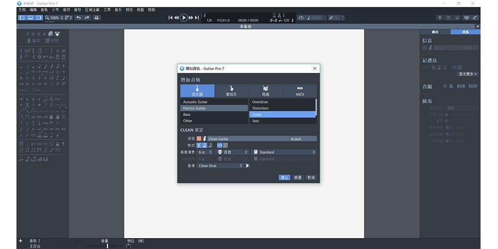 Guitar Pro 7.6可以在任何给定的单个文件中,将使用MIDI音调的音轨与使用RSE音调的音轨混音。