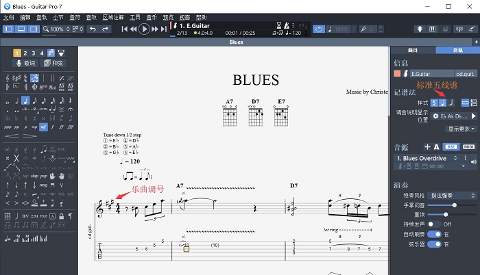 在Guitar Pro中,我们可以输入想要的吉他音色,边播放边跟着进行反复练习。通过使用这款软件,来判断自己是否弹得正确。还可以配合一些单音曲目,把它们练习熟练。只要每天坚持,那就能获得很大的进步。